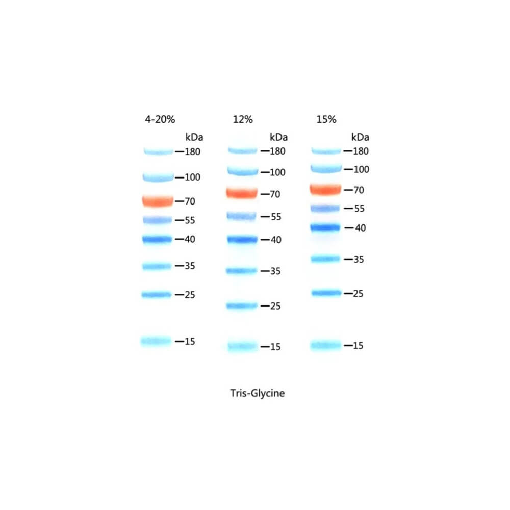 | 條帶分子量 (kDa) | 15, 25, 35, 40, 55, 70, 100, 180 | 10, 15, 25, 35, 40, 55, 70, 100, 150, 250 | 10, 15, 25, 35, 40, 55, 70, 100, 130, 180 | 10, 15, 25, 30, 35, 40, 55, 70, 80, 100, 150, 250 |