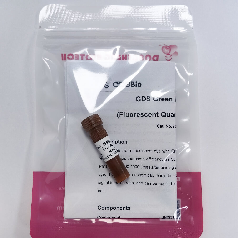 GDS?Green I 是一種結合于 dsDNA 雙螺旋小溝區域的具有綠色發(fā)射光的熒光染料,效能等同于 Sybr Green I。GDS?Green I 與 dsDNA 結合后熒光信號會(huì )增強 800-1000 倍,是一種常用的 qPCR 熒光染料。該染料經(jīng)濟實(shí)惠、使用方便,具有高靈敏度與高信噪比等優(yōu)勢,可應用于基因表達差異分析,基因芯片等。