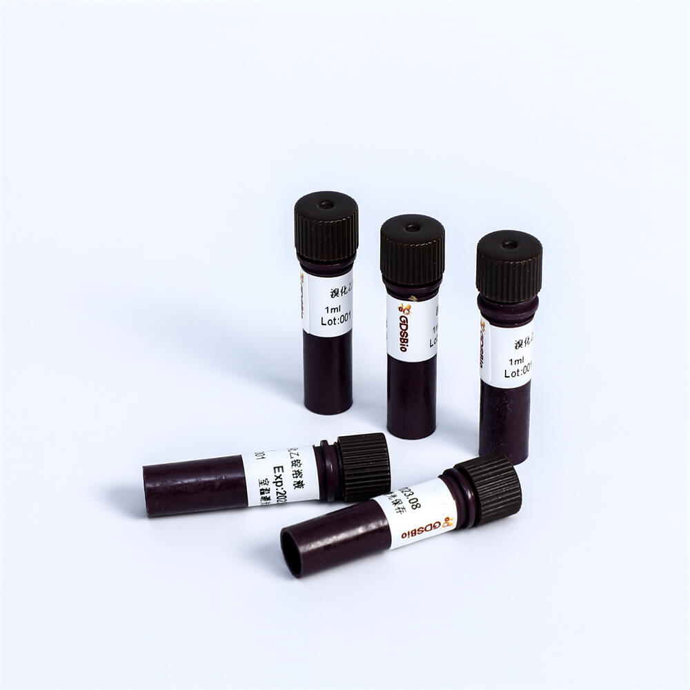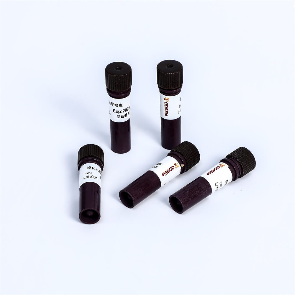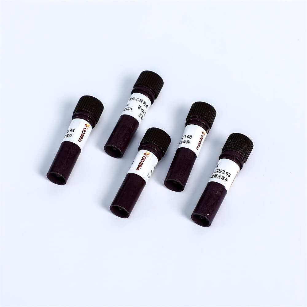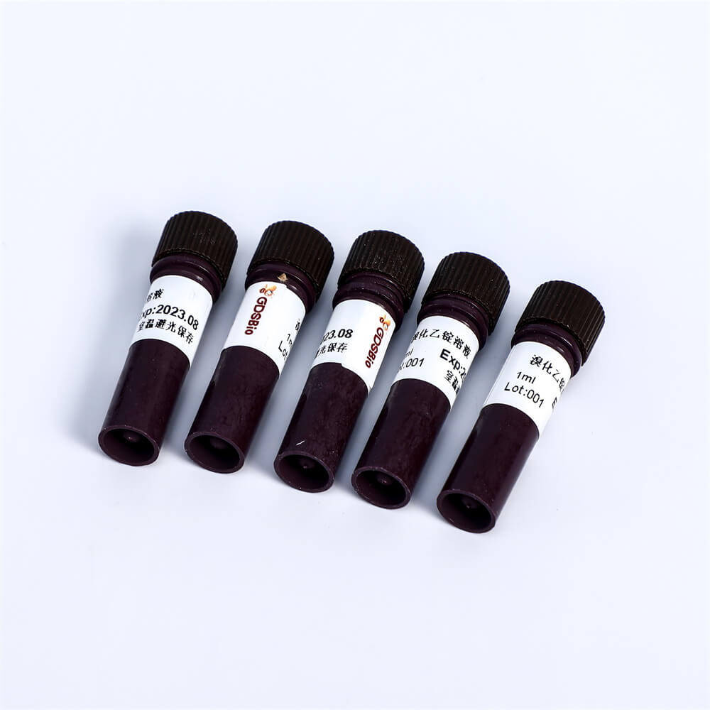 溴化乙錠(Ethidium Bromide, EB)是一種靈敏的熒光染料,常用于?DNA?和?RNA?瓊脂糖凝膠檢測。溴化乙錠是一種?DNA?嵌入?劑,能夠插入雙螺旋?DNA?堿基對之間。溴化乙錠的最大紫外吸收波長(cháng)為?300?和?360 nm,最大發(fā)射波長(cháng)為?590 nm。與溴化乙?錠結合的?DNA?檢出限為?0.5-5.0 ng/條帶。本品以水溶液形式提供,由?10mg/ml?溴化乙錠和高純度水組成。?